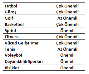 Kreatin Monohidrat bireysel ve takım sporlarında farklı öneme sahiptir. Aşağıdaki tabloda önemlilik dereceleri görülmektedir.