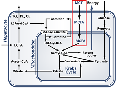 1980’lerde Dr. Vigen K. Babayan kendi laboratuvarında MCT ’yi yüksek miktarlarda üretmenin yolunu bulmuş ve 30 sene içinde kullanım alanlarını genişletmiştir (1). Doğal olarak en fazla hindistan cevizinde bulunmakta ve yaklaşık olarak hindistan cevizi yağının %60 ‘ını MCT oluşturmaktadır. Kalori değeri olarak LCT ‘lerden (uzun zincirli yağ asitleri) daha az kaloriye sahiptirler. MCT gram başına 8.3 kalori içerirken LCT bilindiği üzere gram başına 9.2 kalori içermektedir (2). Bunun yanında MCT, tekrar esterlenmeye gerek duymadan mitokondriye taşınıp hızlı bir şekilde okside olabilir (4). Daha önce l-karnitin makalesinde
